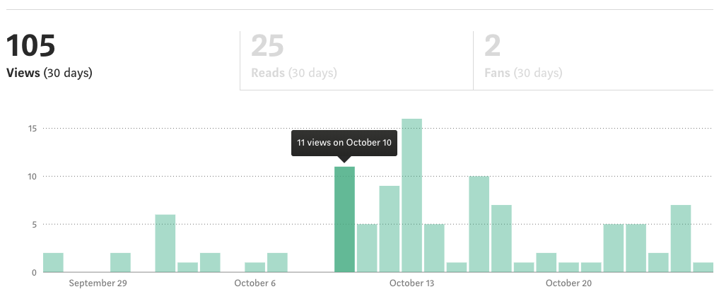 I’ve been pulling in decent viewing number, nothing crazy. About 5.5 views per day ever since I published my “first” article — Fail, Again and Again, Your 1,001st Idea Might Work, — on October 10.