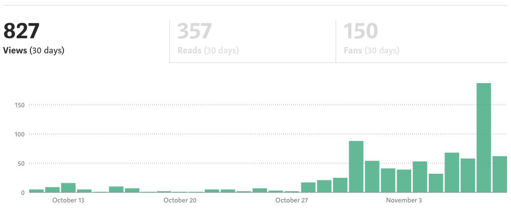 A lot has happened since my last email. Back then, I was solely publishing on Wednesdays, and averaging 5.5 views per day. My record was 16 views in one day, on October 13, and my total views in the past 30 days were 105 — you can read the whole analysis here.