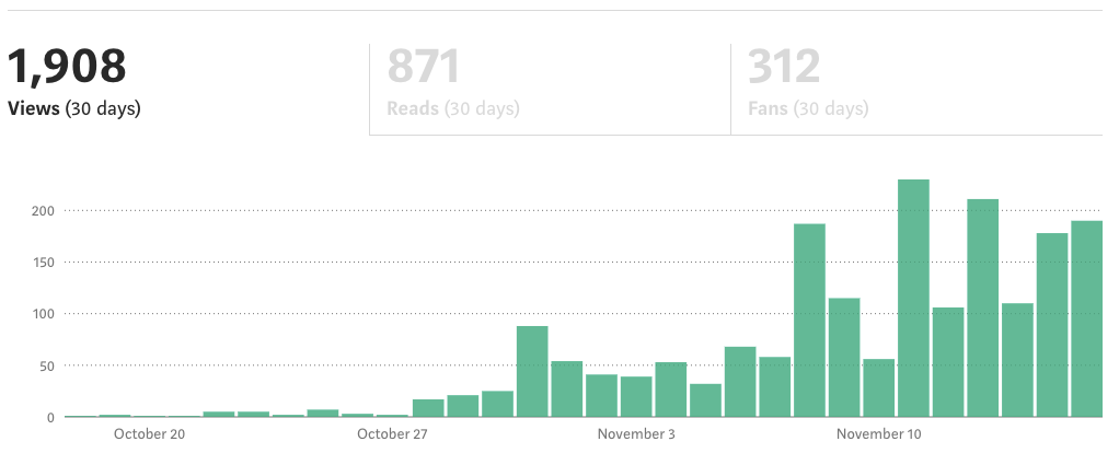 I’ve had 1,100 new views since last week, my fans doubled, and my daily record is now at 230 views, on November 11. Ever since then, I’ve made an effort to keep my views above 100 every day — and my daily average has jumped to 64 views per day.